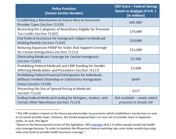 The Senate Parliamentarian’s rulings may jeopardize the viability of the provisions and the significant federal savings associated with their enactment. The table below lists the Senate Finance Committee provisions that the Parliamentarian ruled on and details the estimates from the Congressional Budget Office (CBO). Please note, however, that CBO has not put out estimates of the Senate Finance Committee provisions, so the CBO estimates of federal savings over 10 years are based on CBO’s June 4 analysis of parallel provisions — where available — in the House-passed legislation, H.R. 1.