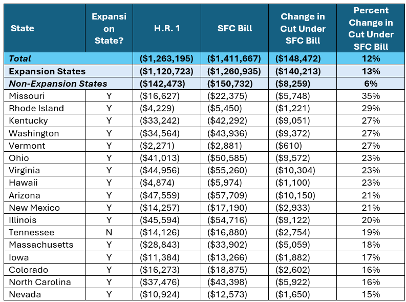 If the SFC language is enacted into law, Virginia and Arizona, two of the nation’s most closely watched “purple” states, would become unwitting members of a new “$10 billion club,” which is to say that they each would lose an additional $10 billion over the next 10 years. These new cuts would be on top of the $47.6 billion and $45 billion that Arizona and Virginia would, respectively, lose under the House bill, according to Manatt’s updated modeling numbers.