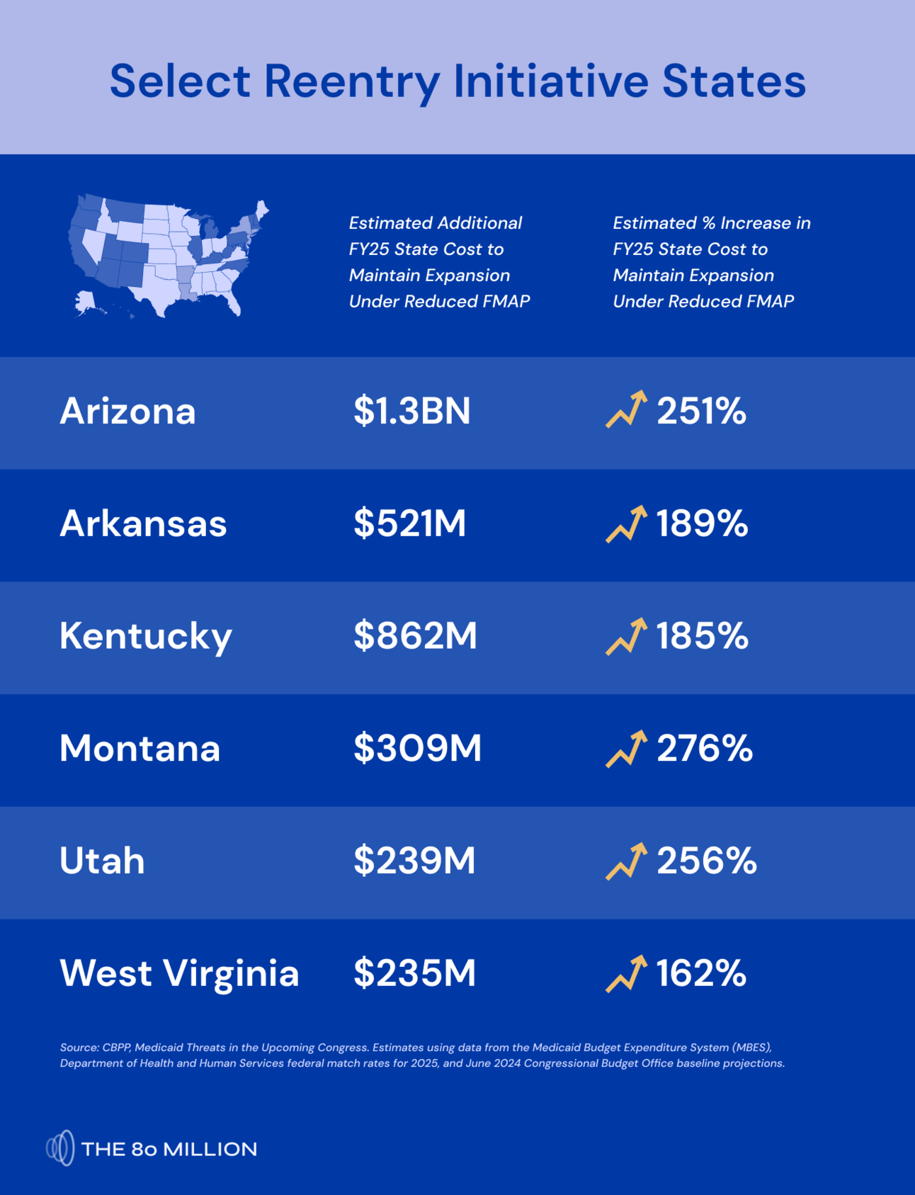 If faced with these levels of Medicaid funding cuts, state Medicaid agencies will be forced to make challenging decisions about scaling back Medicaid program coverage and benefits, and reentry initiatives would likely be on the chopping block.