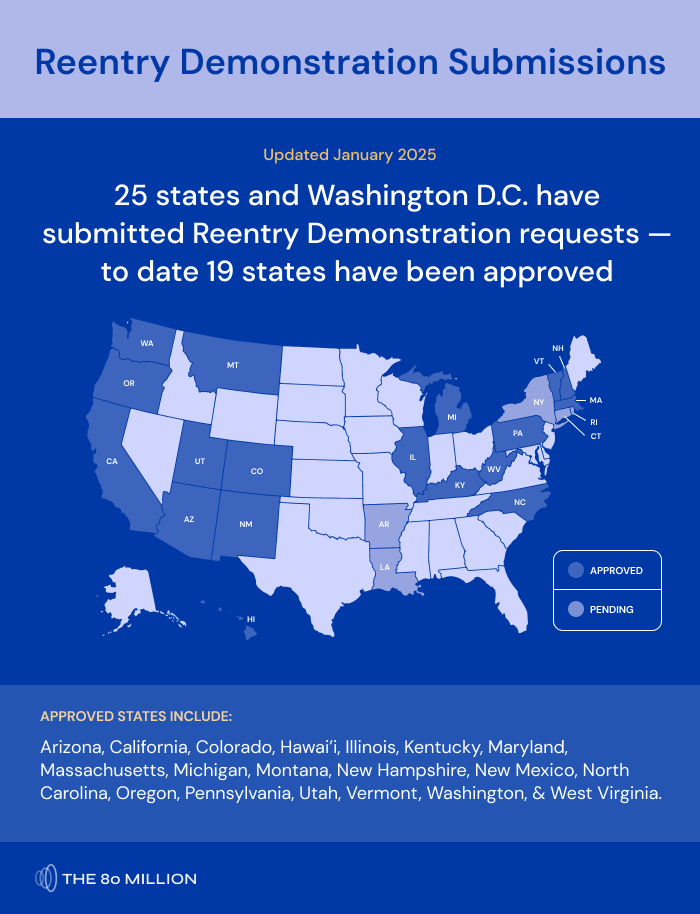 Reentry Initiatives have bipartisan support with 25 states and D.C. pursuing them; 19 demonstrations have already been approved by CMS and are being implemented.