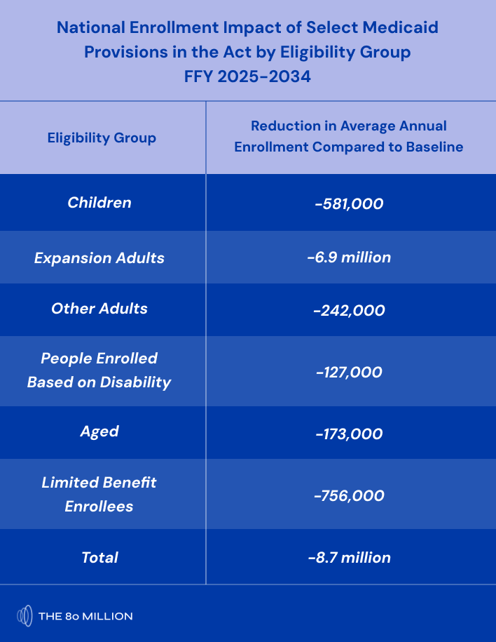 The estimates consider the interactions across these provisions. Manatt has also updated its estimates to include the impact of repealing two eligibility and enrollment rules, revised projections of the expected impact of mandatory work requirements, and estimated enrollment losses by eligibility group.