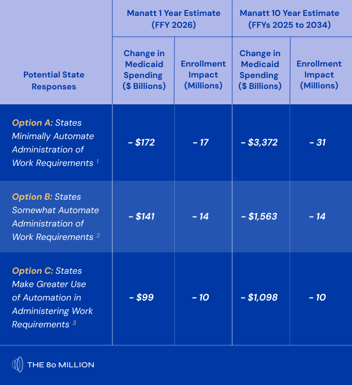 Manatt Health estimates that anywhere from 5.3 million to 30.8 million Medicaid enrollees would lose coverage, depending on the way in which the mandate is ultimately structured.1 This wide range reflects just how much variation is possible — and how critical what Congress ultimately puts forward will be to coverage termination consequences.